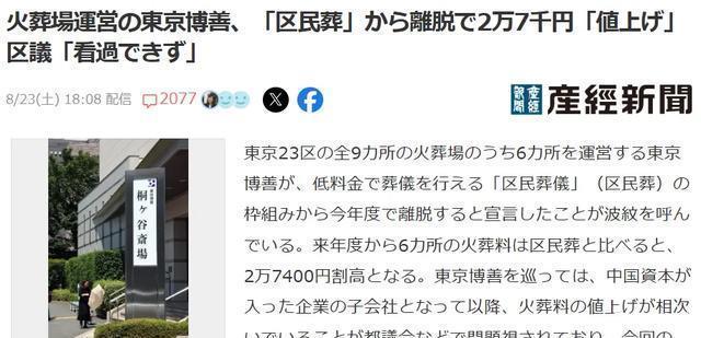 这位罗怡文什么来头?日经中文网报道显示,罗怡文1989年赴日,1992年创办中文产业公司。机缘巧合之下,罗怡文加入苏宁易购集团收购的日本著名老牌家电量贩店Laox(乐购仕)。在罗怡文手上,Laox还一度成为日本规模最大的免税连锁企业之一。 也就是说,东京都70%的火葬场实权,都掌握在中国人手里。 面对这个事实,日本人情绪非常激动,议员、专家、民众都炸了,日媒甚至夸张放话: 东京穷人以后死不起了,怪中国资本。